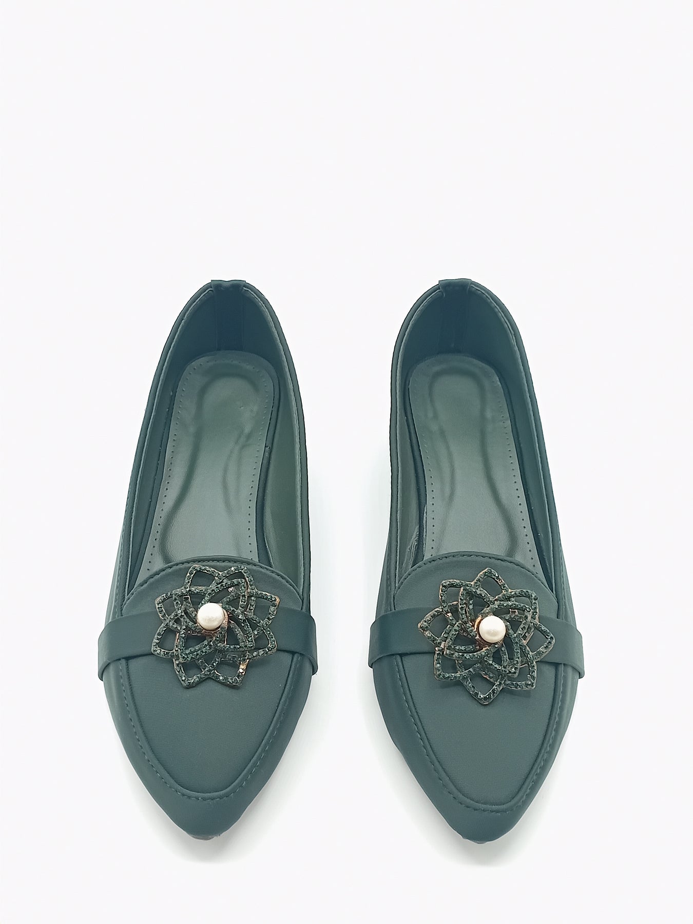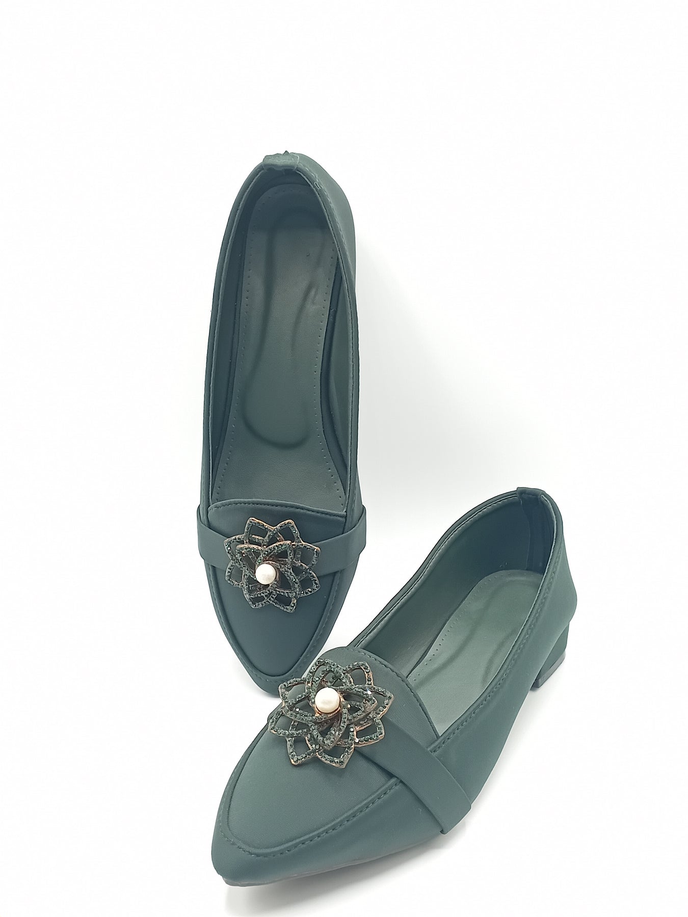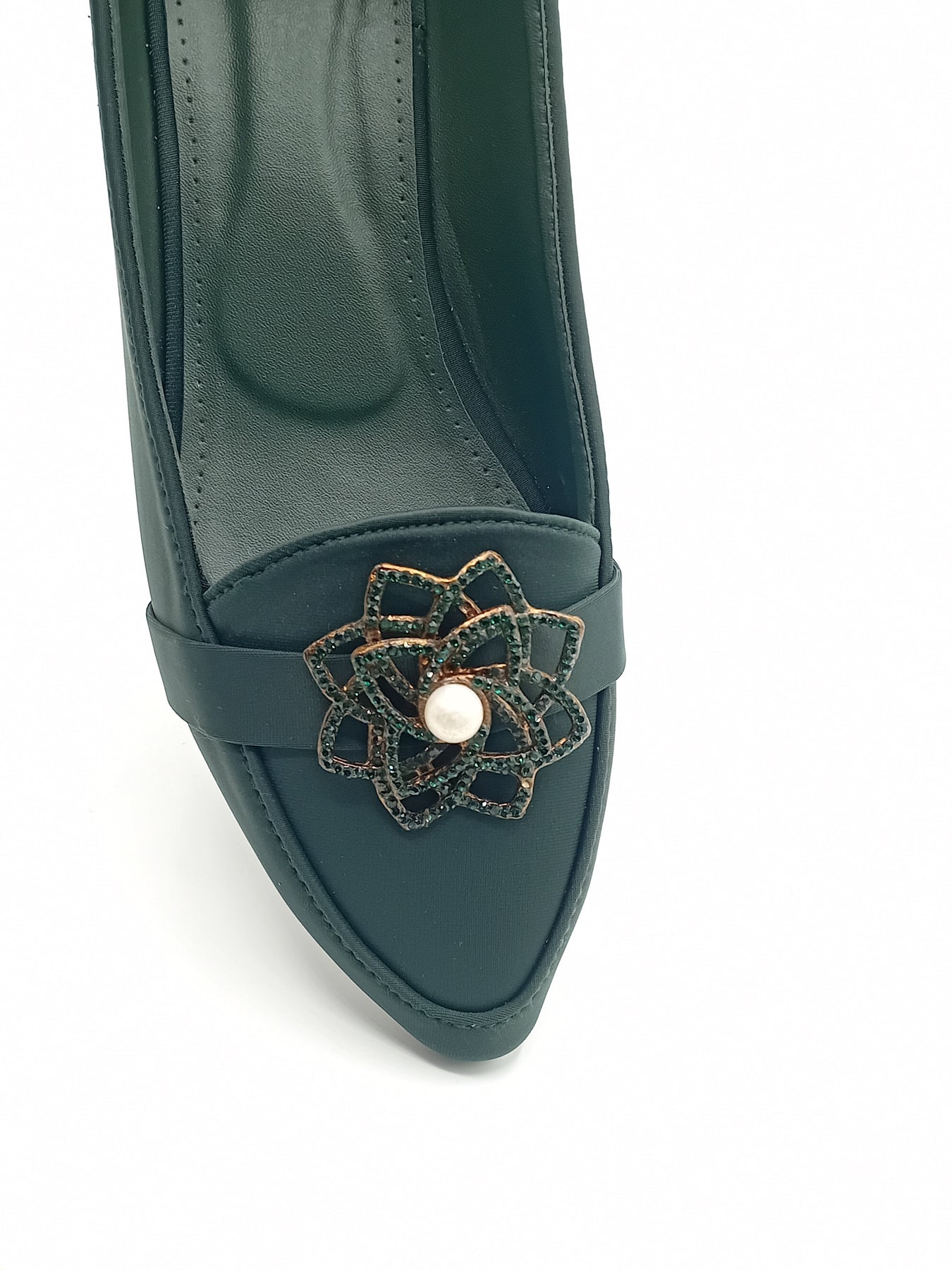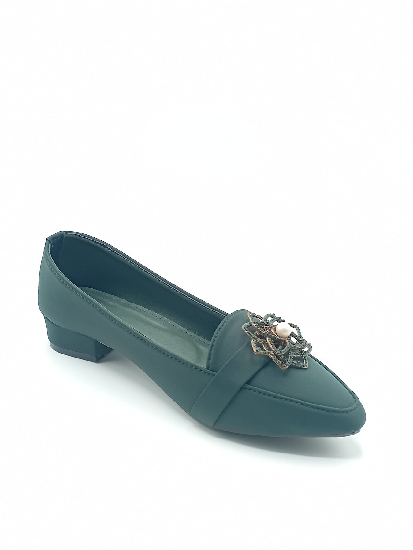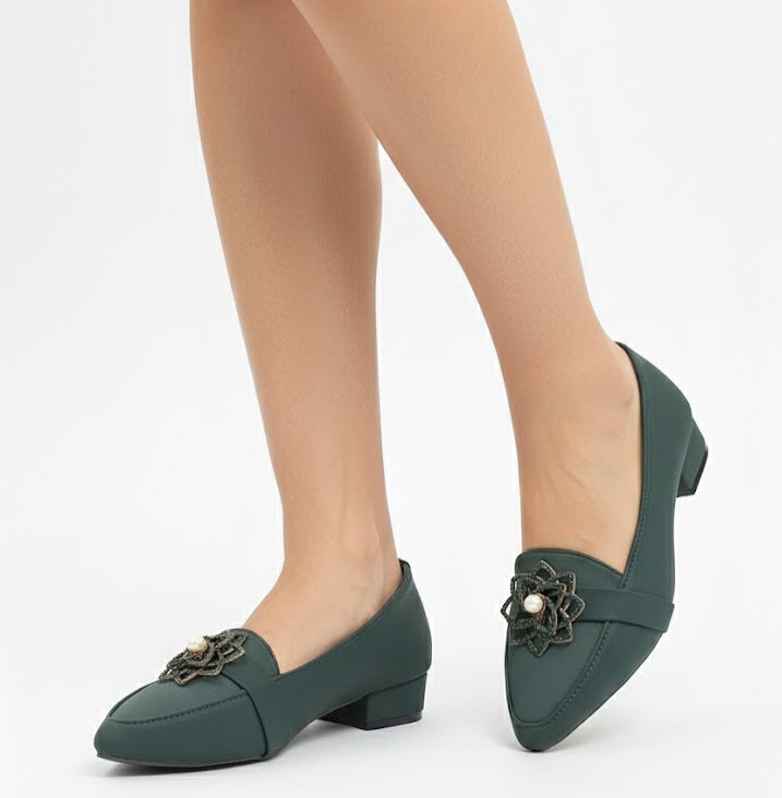 These elegant ladies formal shoes are designed to give a smart and graceful look. The front is beautifully decorated with a stylish metal flower brooch and pearl detail, making them perfect for formal and semi-formal occasions.